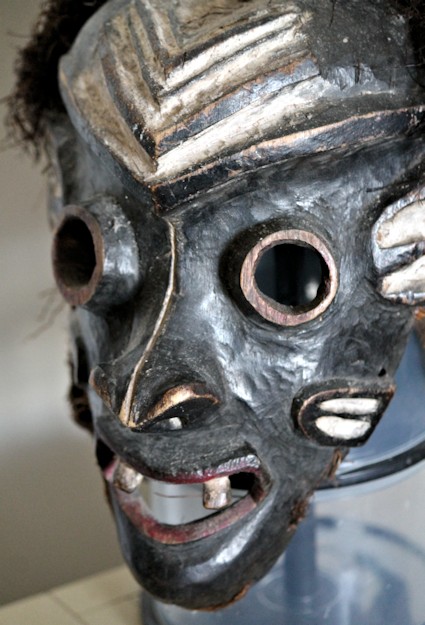 Overall condition: good; basic wear & tear, scrapes & abrasions, a chip along the mask's left rim plus a few minor chips, faded pigments, fraying & tears in the fragile fabric covering, & wear & tear to the fragile feathers. Significant age- & use-related wear. Rich patina. The mask makes a most haunting & powerful display, & would be a superb addition to any serious ethnographic collection.
