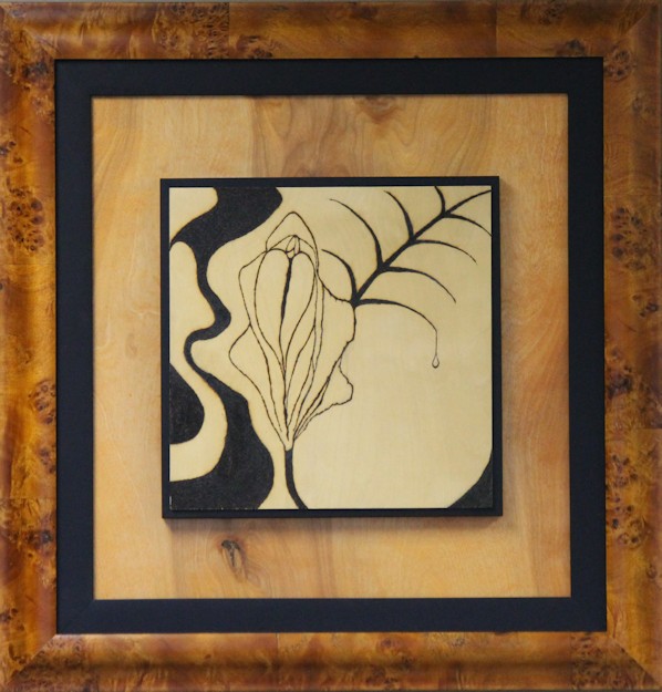 The surface of this magnificently presented original birchwood panel, whose outer burlwood-framed dimensions measure approximately 25"W x 25"H, has been 'etched' by training the sun's rays & energy through a magnifying lens which produces a tiny laser-like beam… When focused on the wood, the resulting 'laser' burns the wood's surface. Reliant on weather conditions & difficult to control, the process is time-consuming & painstaking, often requiring several days, or even weeks, to complete. Although this medium has been in practice for centuries, it remains uncommon in the artworld.