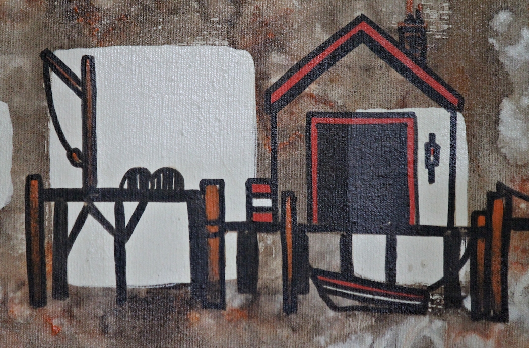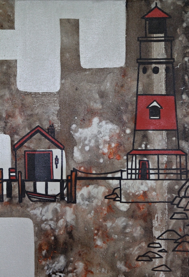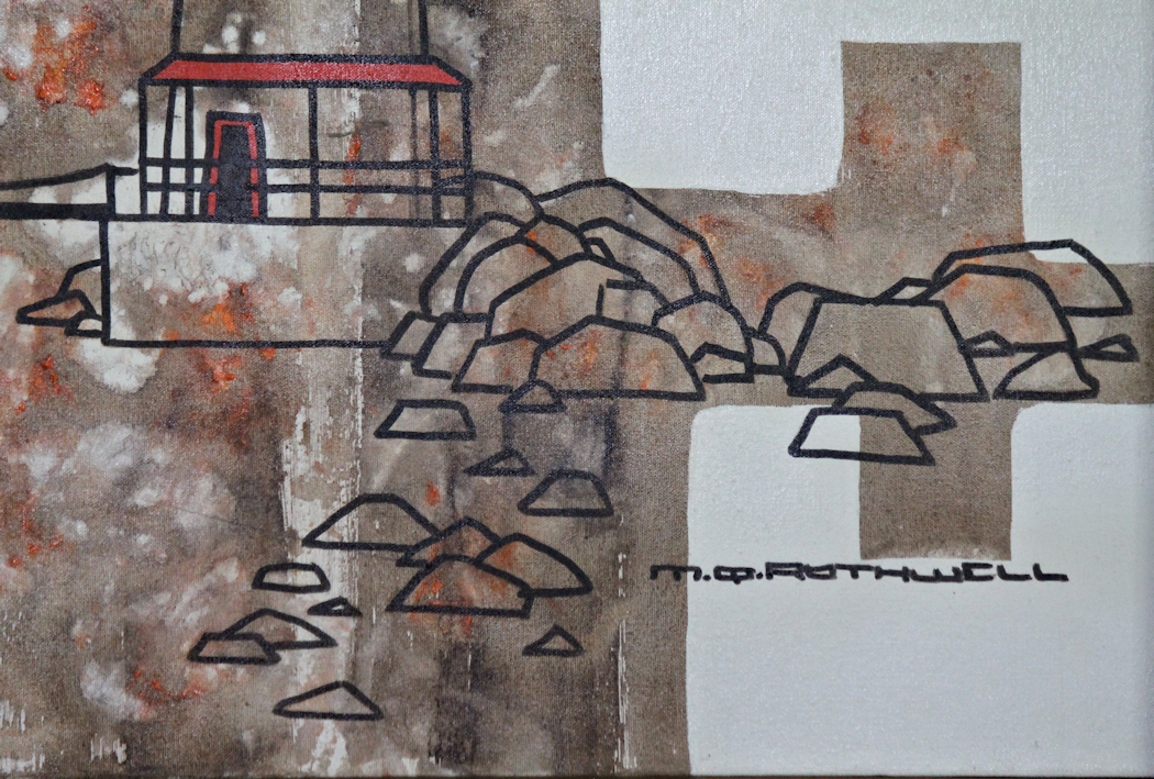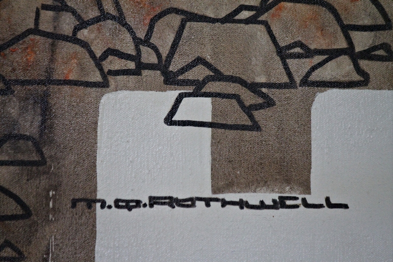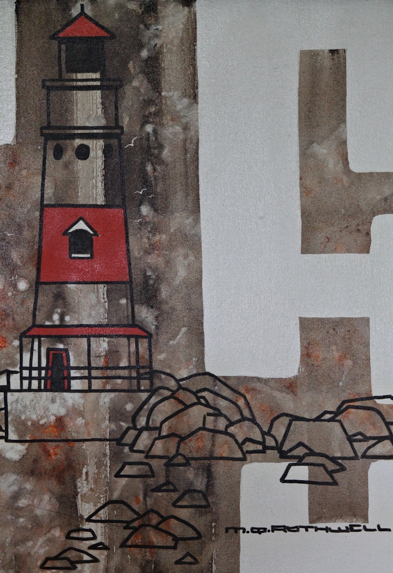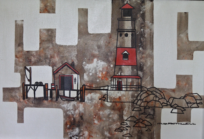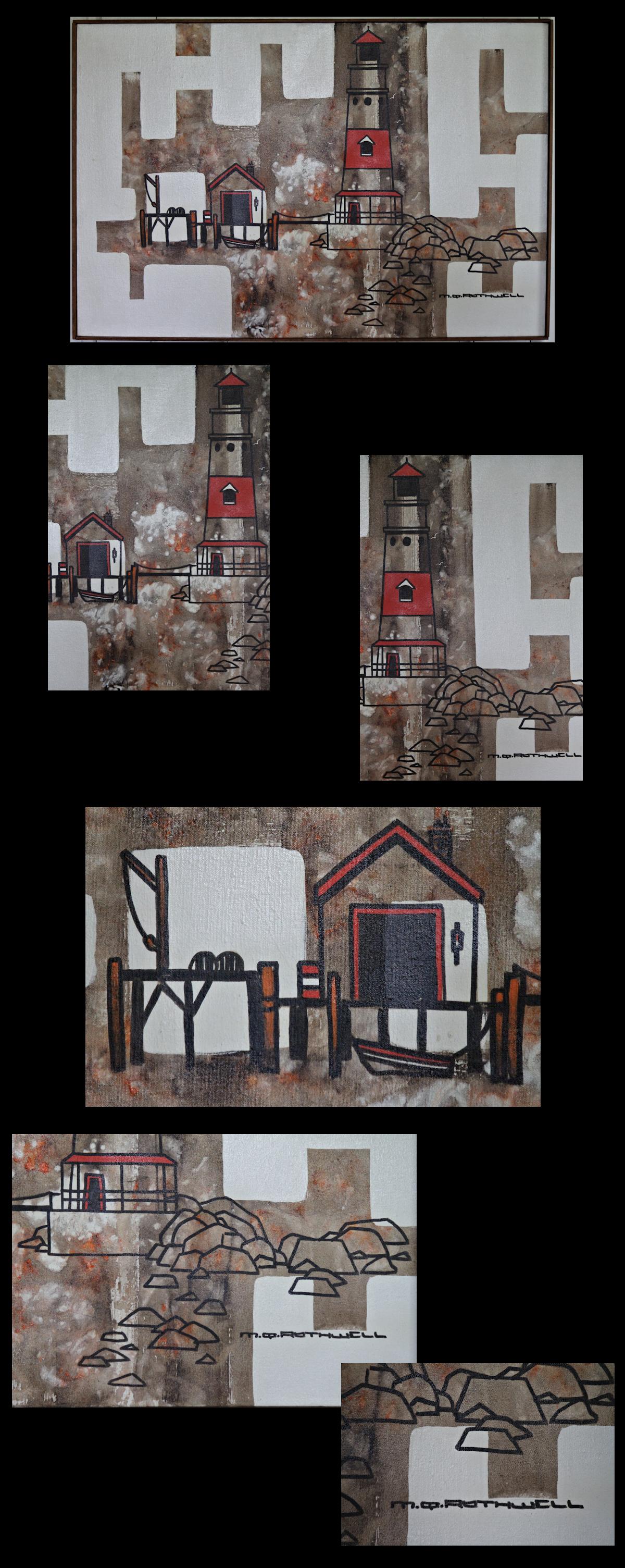 On offer from our personal collection is a bold, original painting of a stylized lighthouse scene by recognized artist, M.Q. Rothwell. Rothwell's strengths lie in clearly defined graphic design concepts set in stark contrast against an abstract palate. A clean, contemporary wood frame surrounds the 3-feet wide canvas with a narrow, 1/4" lip (the wooden frame measures ca. 1 5/8" in depth). We believe the piece dates from the 1960s.