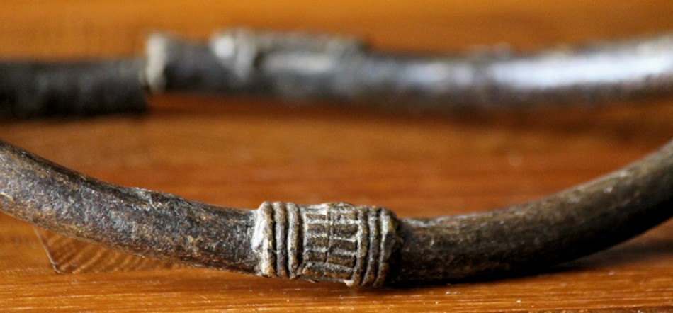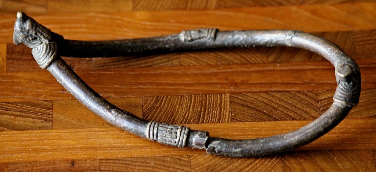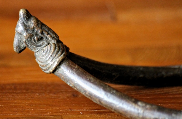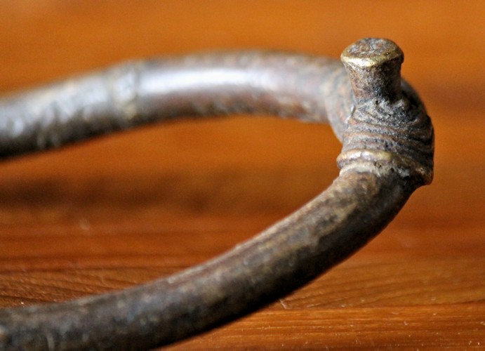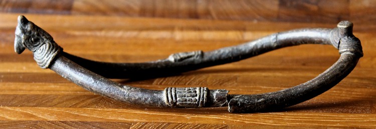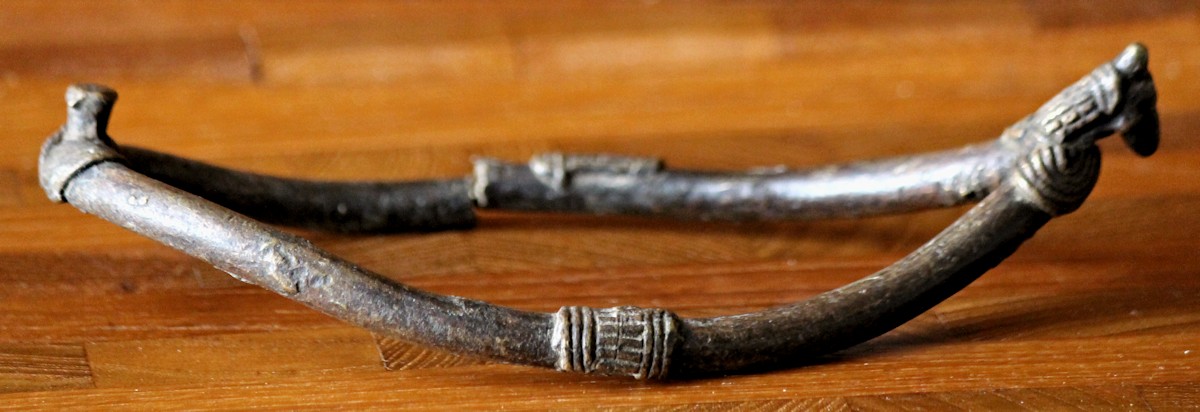 On offer from our personal collection is this handsome bronze/brass anklet from the Senufo peoples of Ivory Coast. Skilled metal workers, this piece is a fine representation of Senufo artistry in the realm of lost wax casting. An older piece, the anklet features fine detailing including the head of a horse mounted on one end & knob at the other, both adorned with semicircular concentric designs. Similar to raised scarifications, striated patterns are found midway on either side of the anklet.