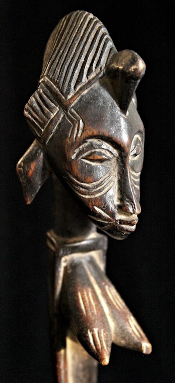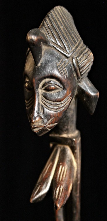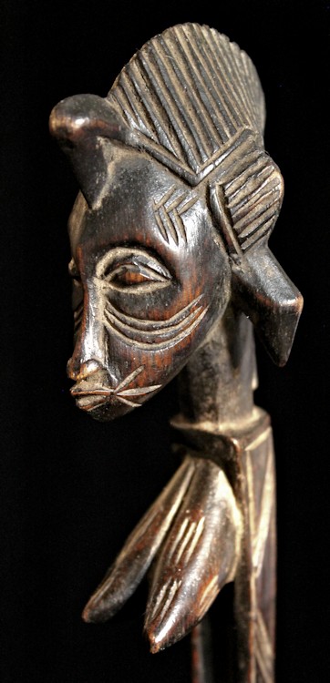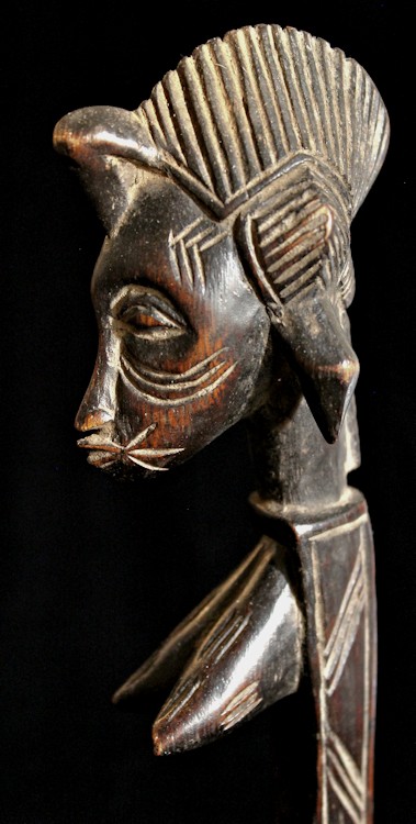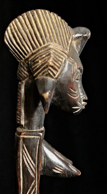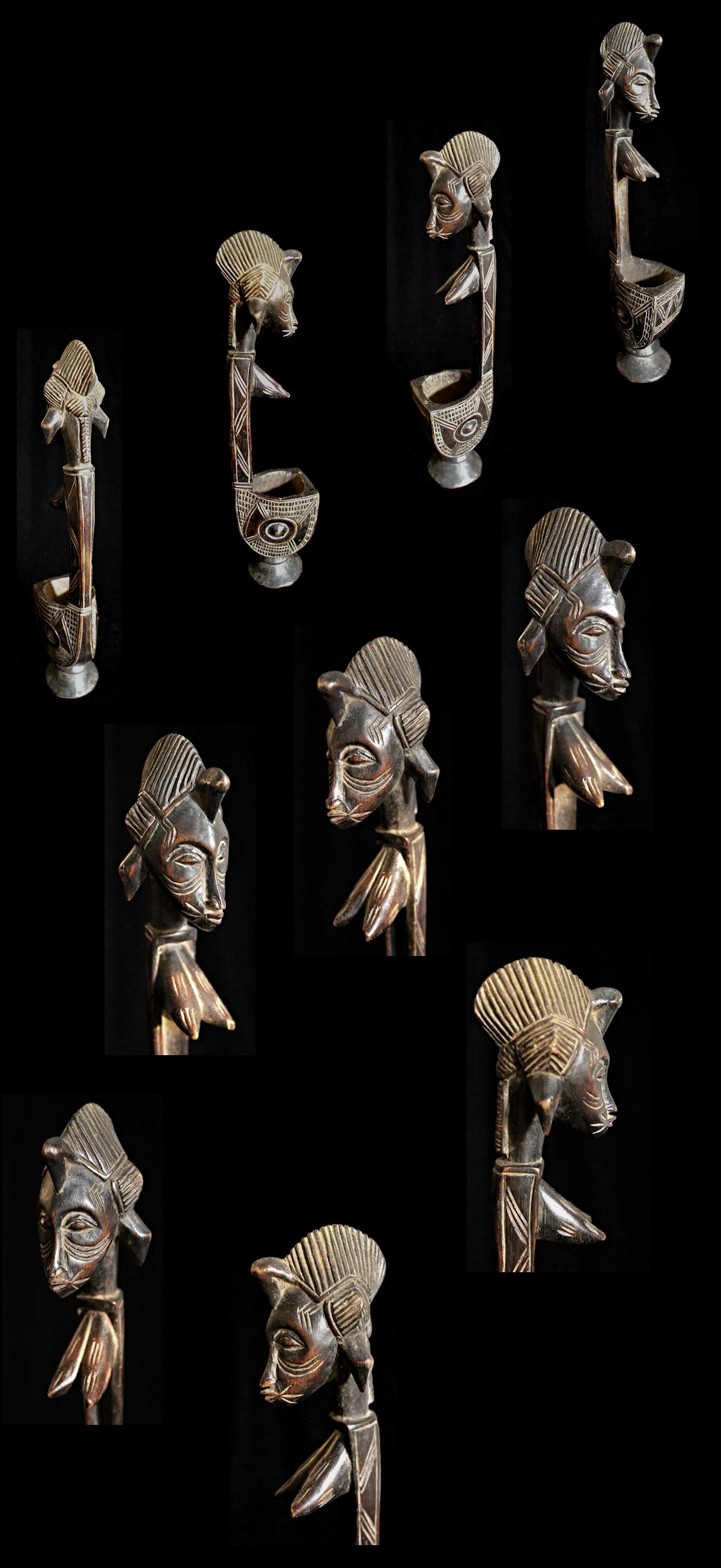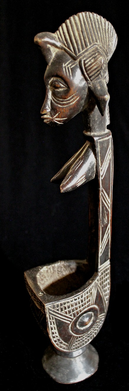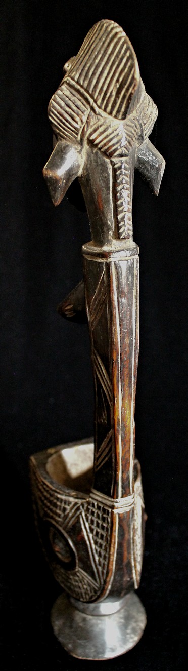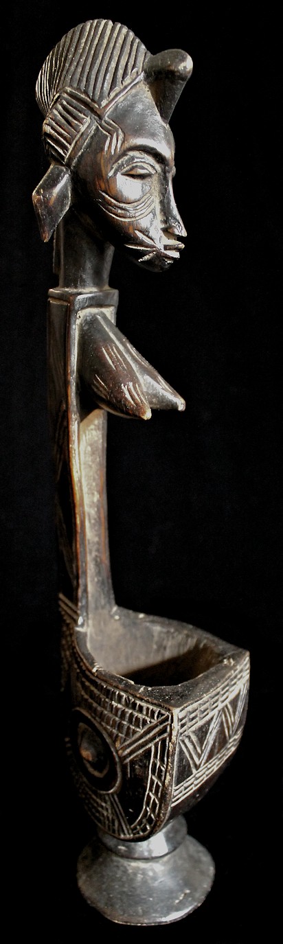 From our personal collection, on offer is this elegant figural bowl/receptacle from the Senufo peoples of the Ivory Coast. Known for their artistry as woodcarvers, this piece is a fine example of the sculpting skills of the Senufo.