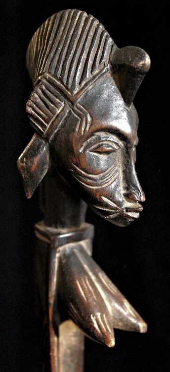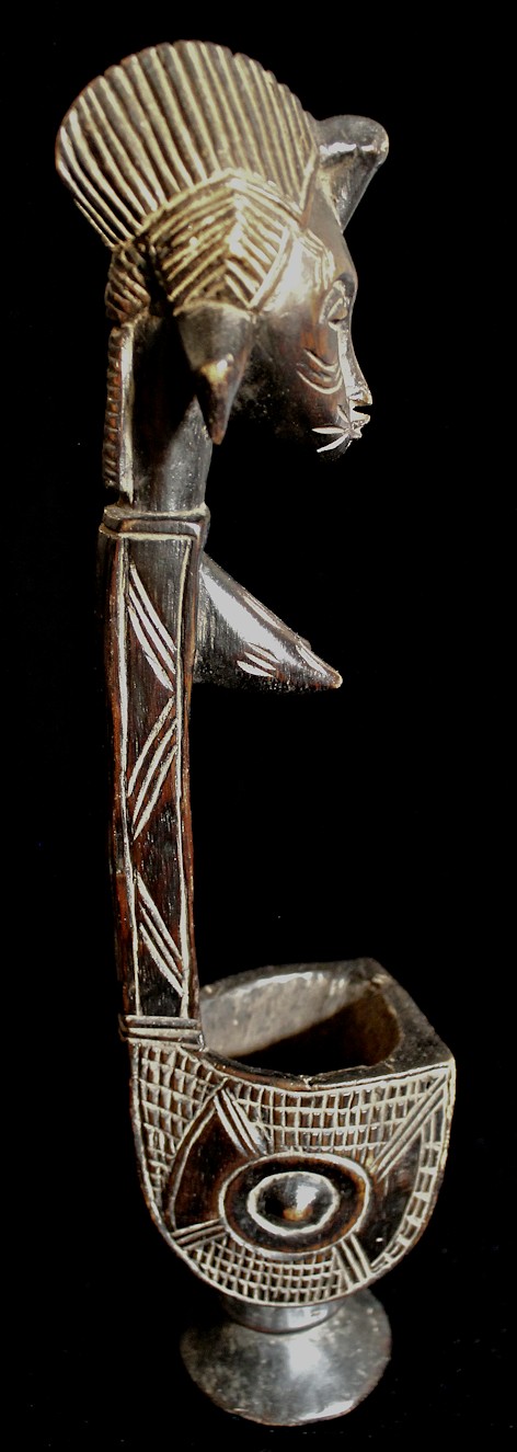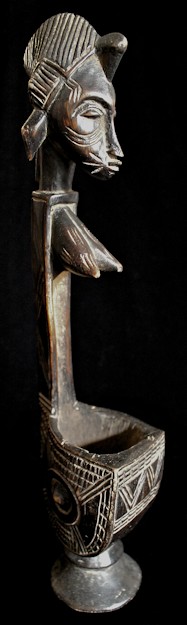 Finely carved details characterize this sensitive piece. Beautifully sculpted, a long, thin nose compliments the elongated face. Incised scarifications highlight the cheeks & brow, & either side of the protruding lips, as well as the prominent breasts. Crowning the head is a wonderfully elaborate coiffure. A combination of raised & incised geometric motifs decorate the outer sidewalls of the bowl & the body's slender form that functions as a graceful stem.