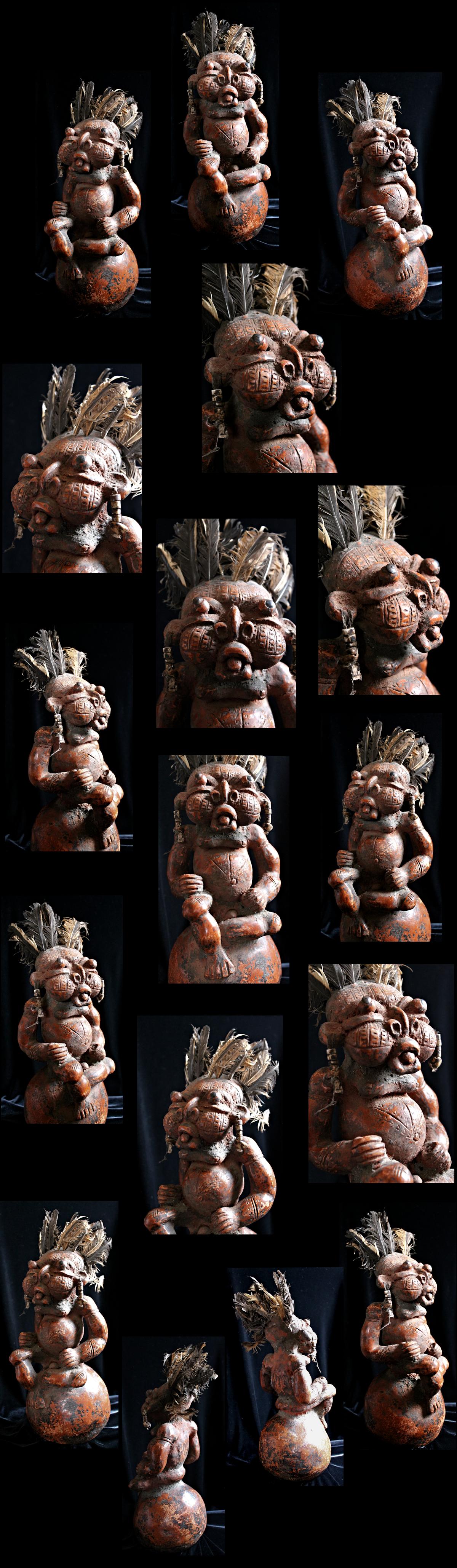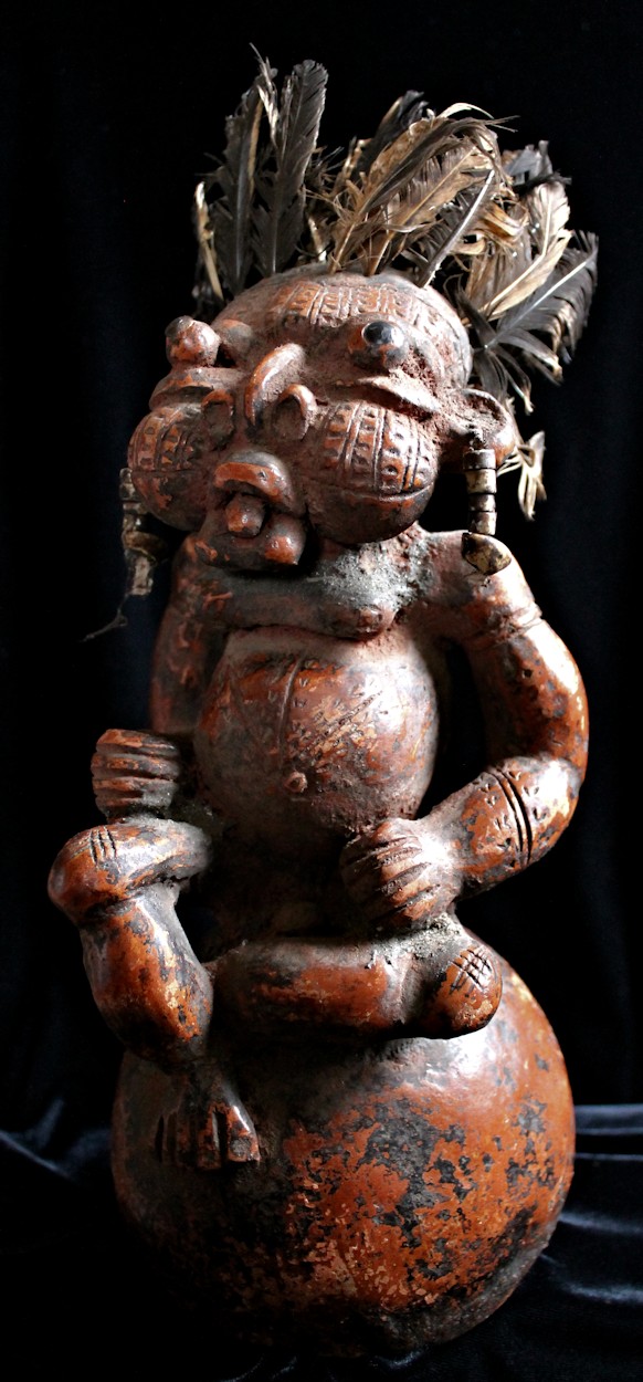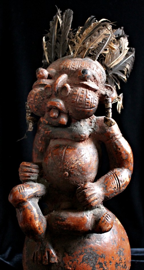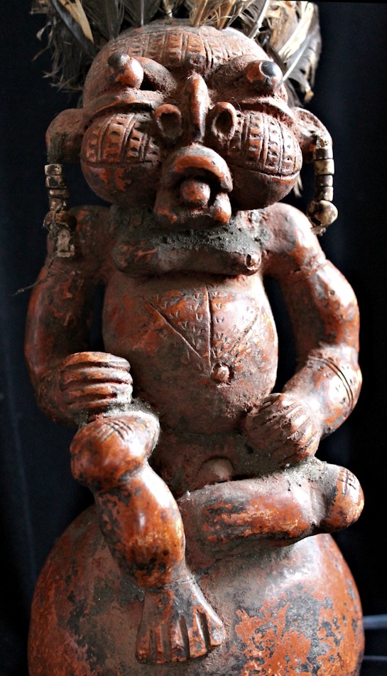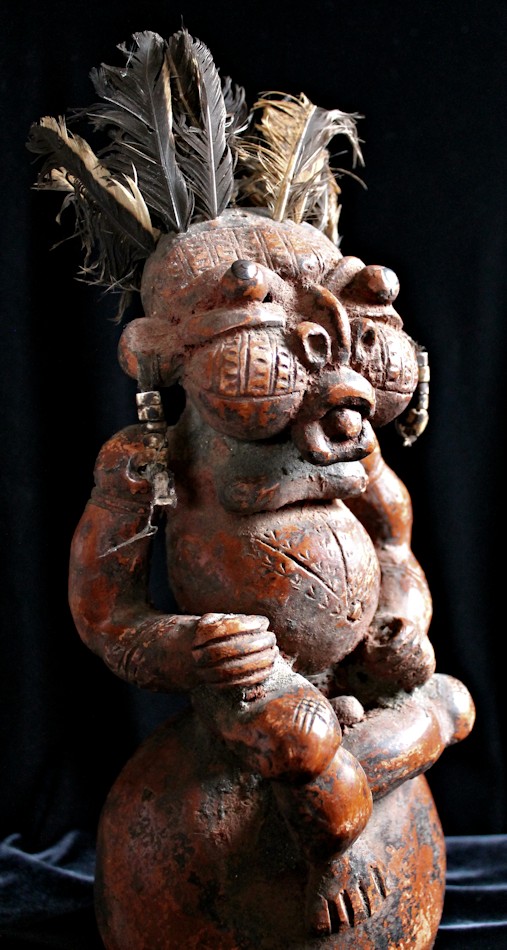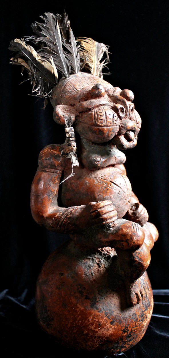 An unusually large, complex, & detailed piece, the figure here is sitting cross-legged atop a large globe, & appears to be clenching some sort of power objects in its closed fists. Classic bulbous features characterize this wild & whimsical sculpture, with bulging eyes (inset with small black discs) & protruding tongue. The face, torso, & limbs are impressed with multiple scarification patterns. Earrings with cowrie shells dangle from both ears, & the top of the head is studded with plugs of feathers.