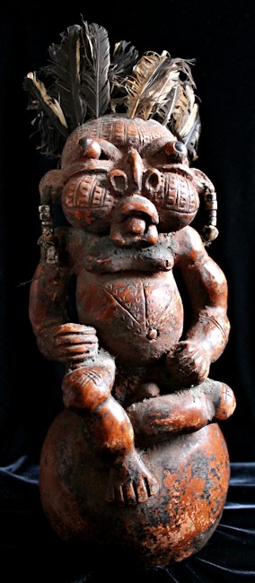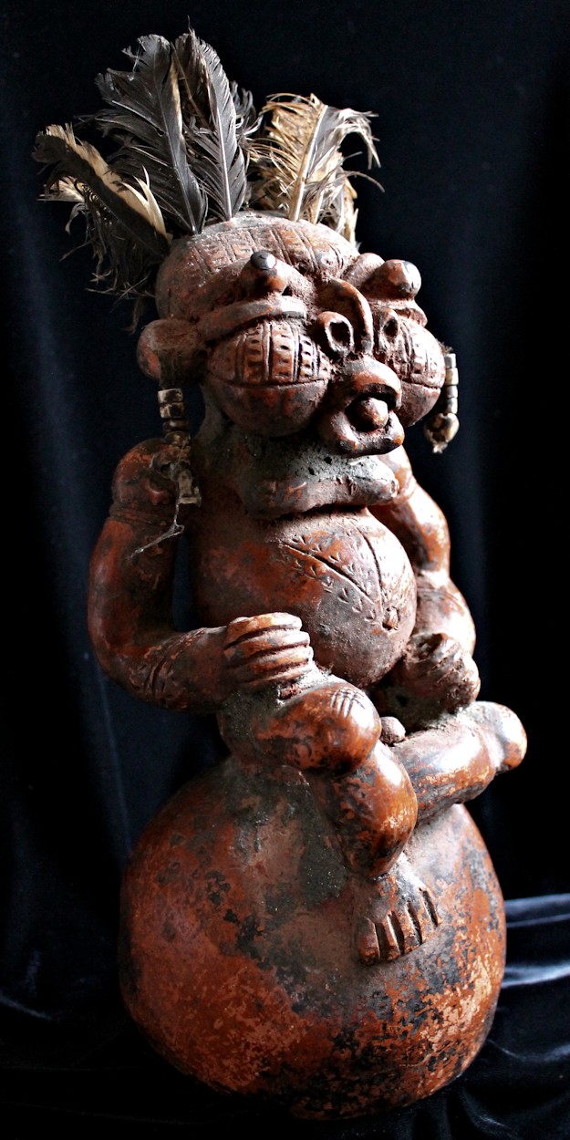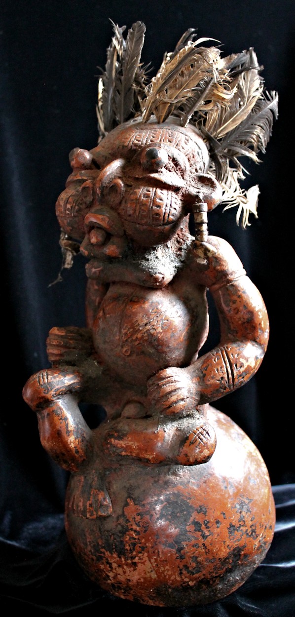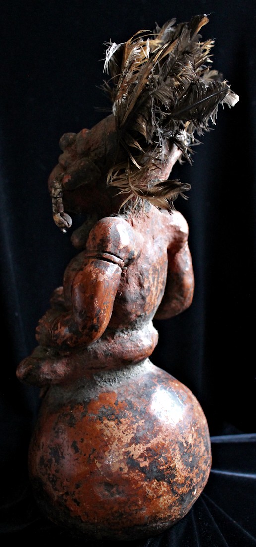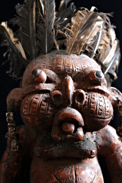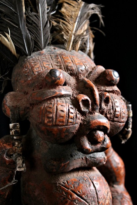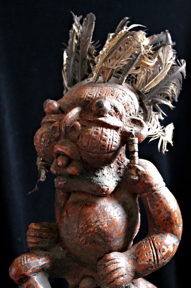 An unusually large, complex, & detailed piece, the figure here is sitting cross-legged atop a large globe, & appears to be clenching some sort of power objects in its closed fists. Classic bulbous features characterize this wild & whimsical sculpture, with bulging eyes (inset with small black discs) & protruding tongue. The face, torso, & limbs are impressed with multiple scarification patterns. Earrings with cowrie shells dangle from both ears, & the top of the head is studded with plugs of feathers.