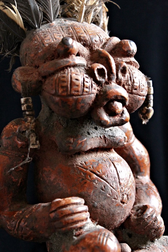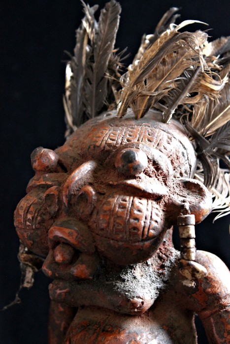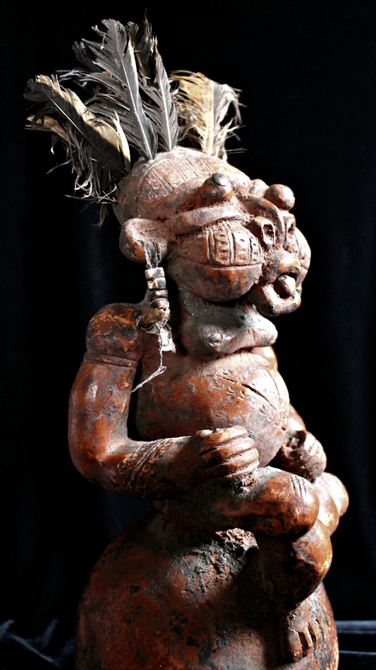 On offer from our personal collection is this superb clay/terracotta figure, known as a house god, produced by the Tikar peoples of Cameroon. The people of the Cameroon region are noted for their high level of artistry, & as with their neighbors, the Bamum/Bamun & Bamileke, the Tikar excel with their imaginative & conceptual sculptures.