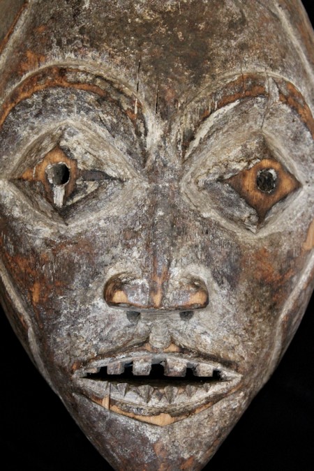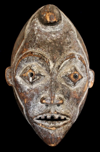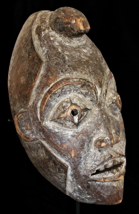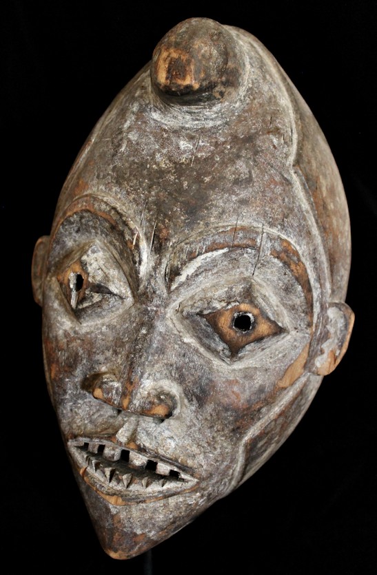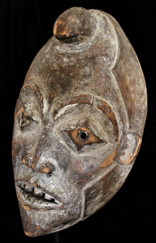 With its piercing, penetrating gaze, the mask's intense & imposing presence is immediately felt... Carved teeth lend a fierce attitude to the spirit of the piece. Pigment has been applied to the surface of the mask, & a protruding top knot adorns the upper brow.
